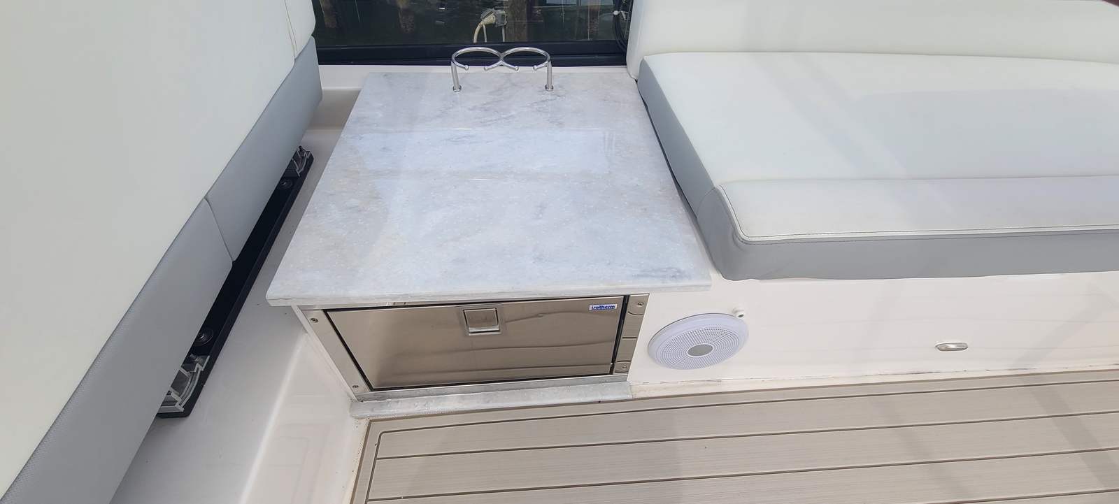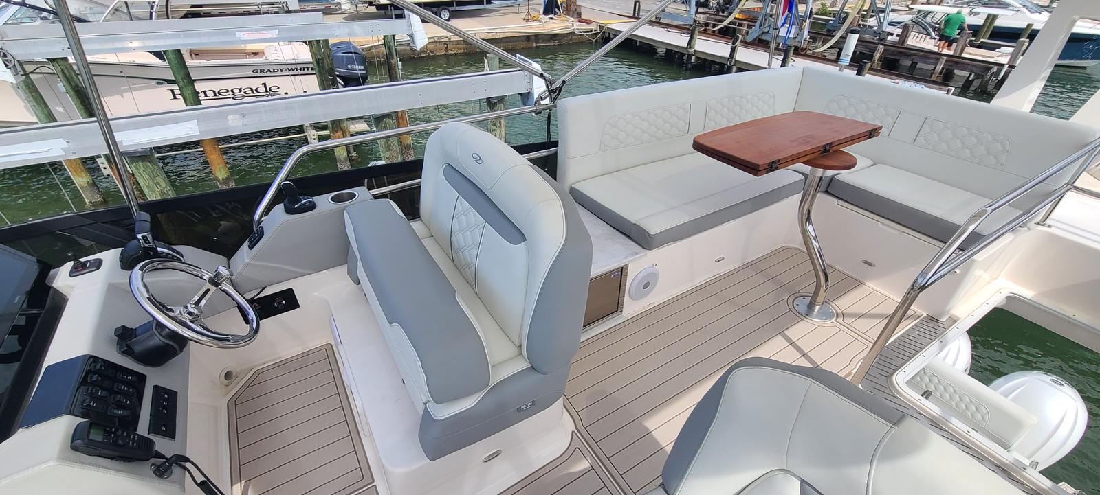 On the Bridge we have the Twin Garmin screens, Second station with Joystick, VHF Radio, Cockpit table, Seat covers all around, Custom flooring and refrigerator.