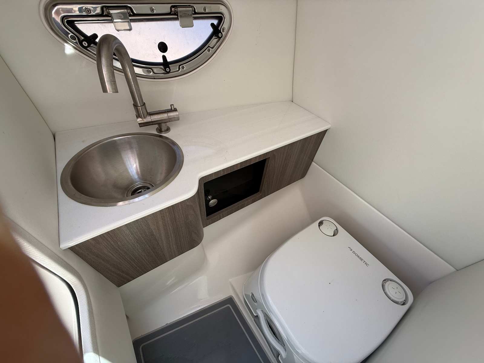 • Private head compartment with stainless steel sink, opening port light and portable marine toilet with dockside waste removal system.