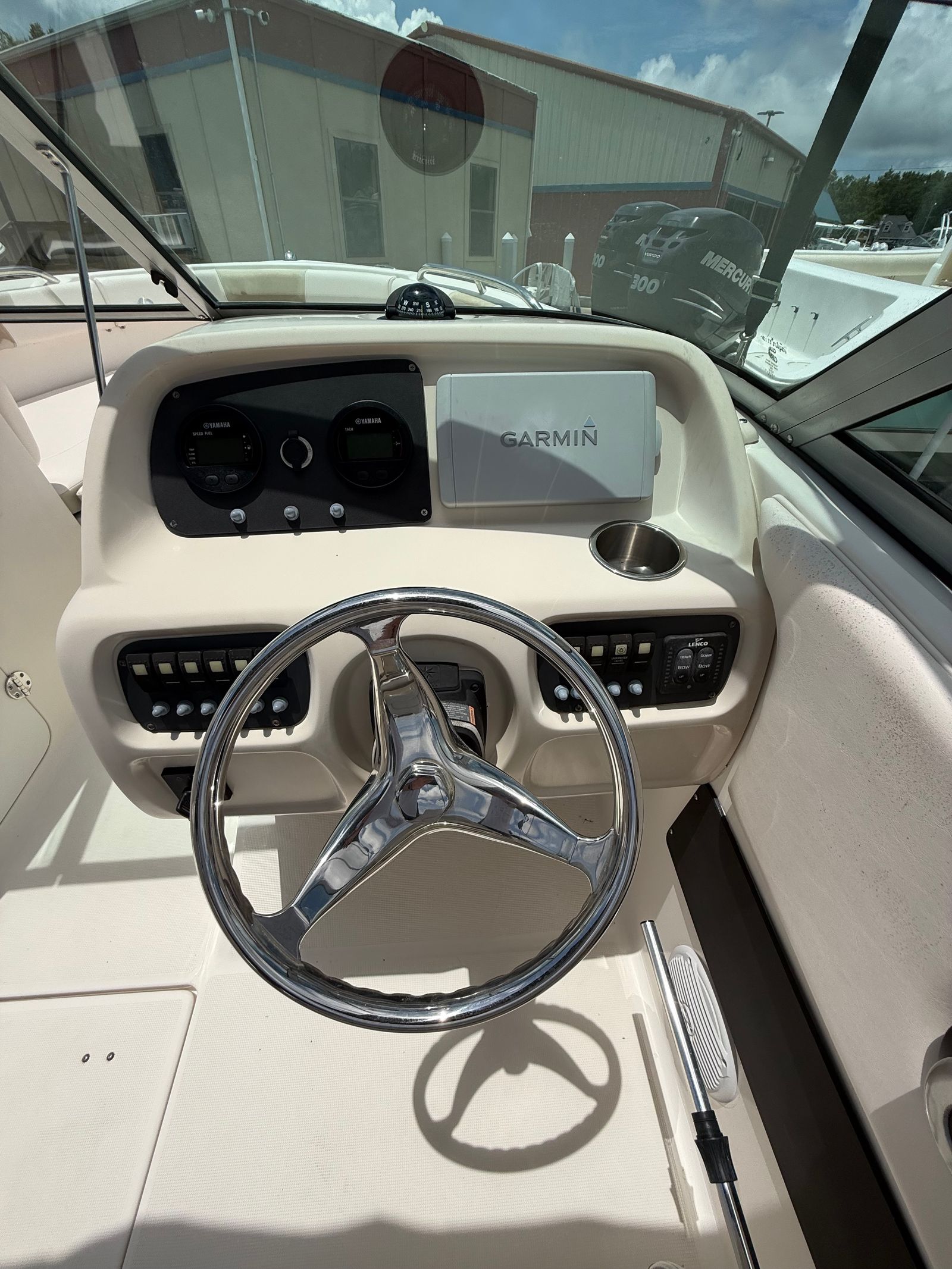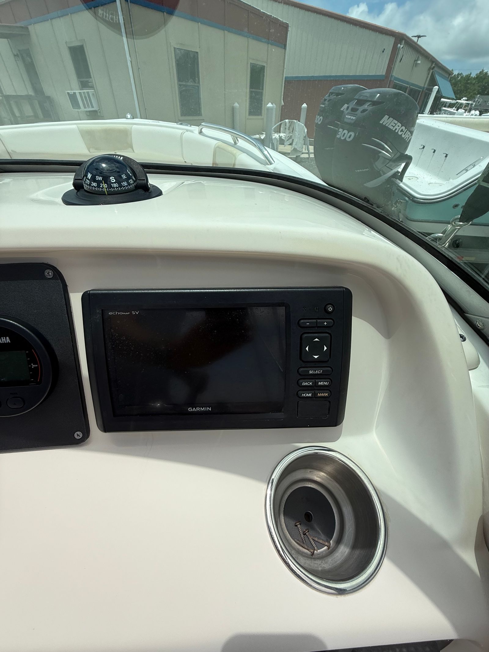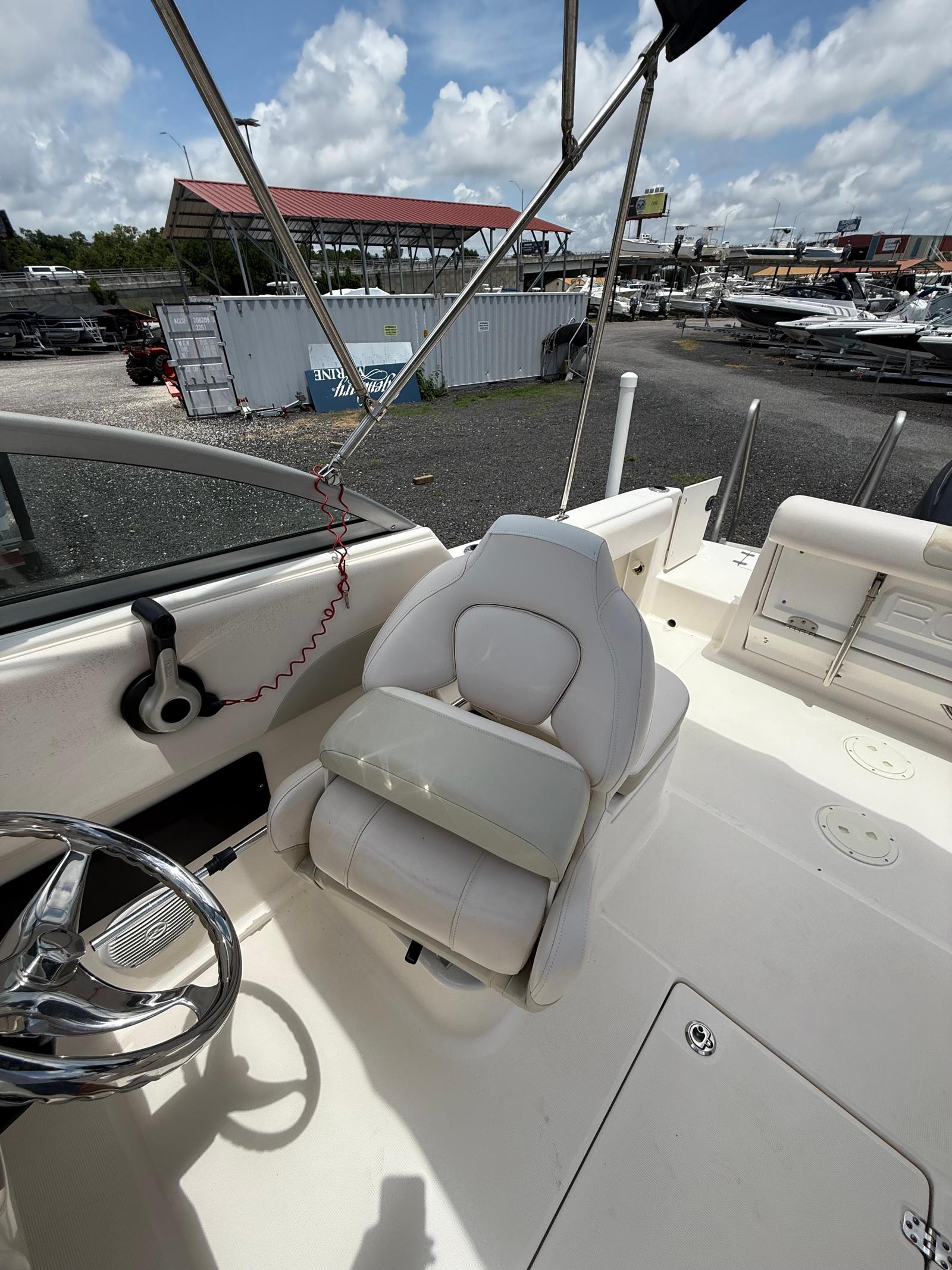 This 22'7" dual console layout offers the best of both worlds—comfort and fishability. Features include a spacious bow seating area with removable cushions, a portside enclosed head, and a convertible aft bench. Anglers will appreciate the livewell, in-floor fish boxes, rod storage, and a roomy aft deck with non-skid surfaces. The helm is equipped with a Garmin GPS/fishfinder, a premium sound system, and stainless-steel controls.