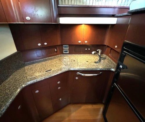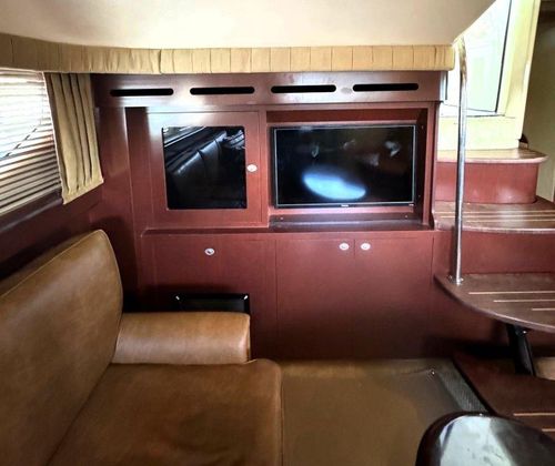 The salon is bright and open, perfect for entertaining, with a fully equipped galley that will please any onboard chef. Head up to the fully enclosed bridge, where A/C and heating let you cruise in comfort year-round — all while enjoying panoramic 360° views.