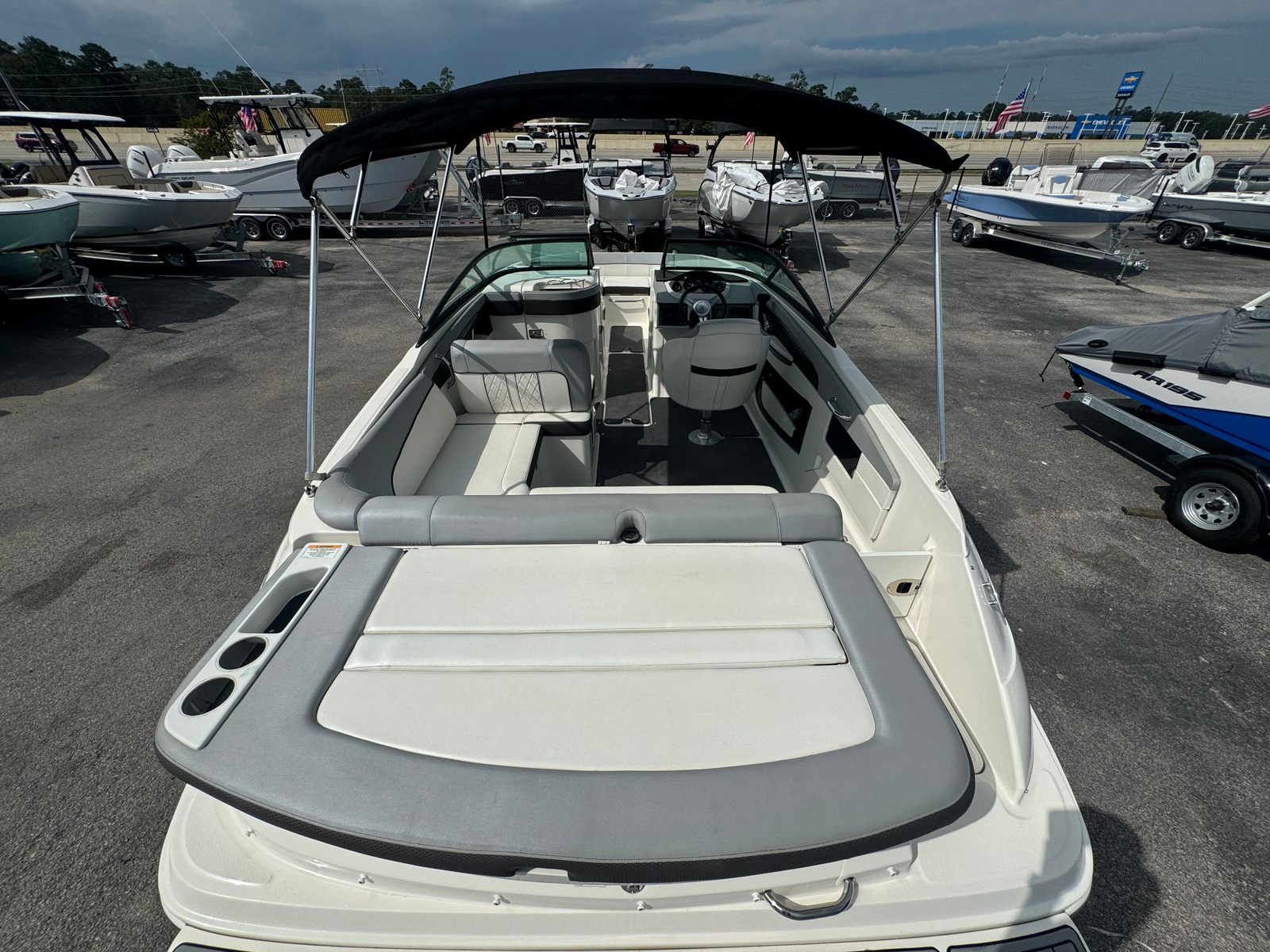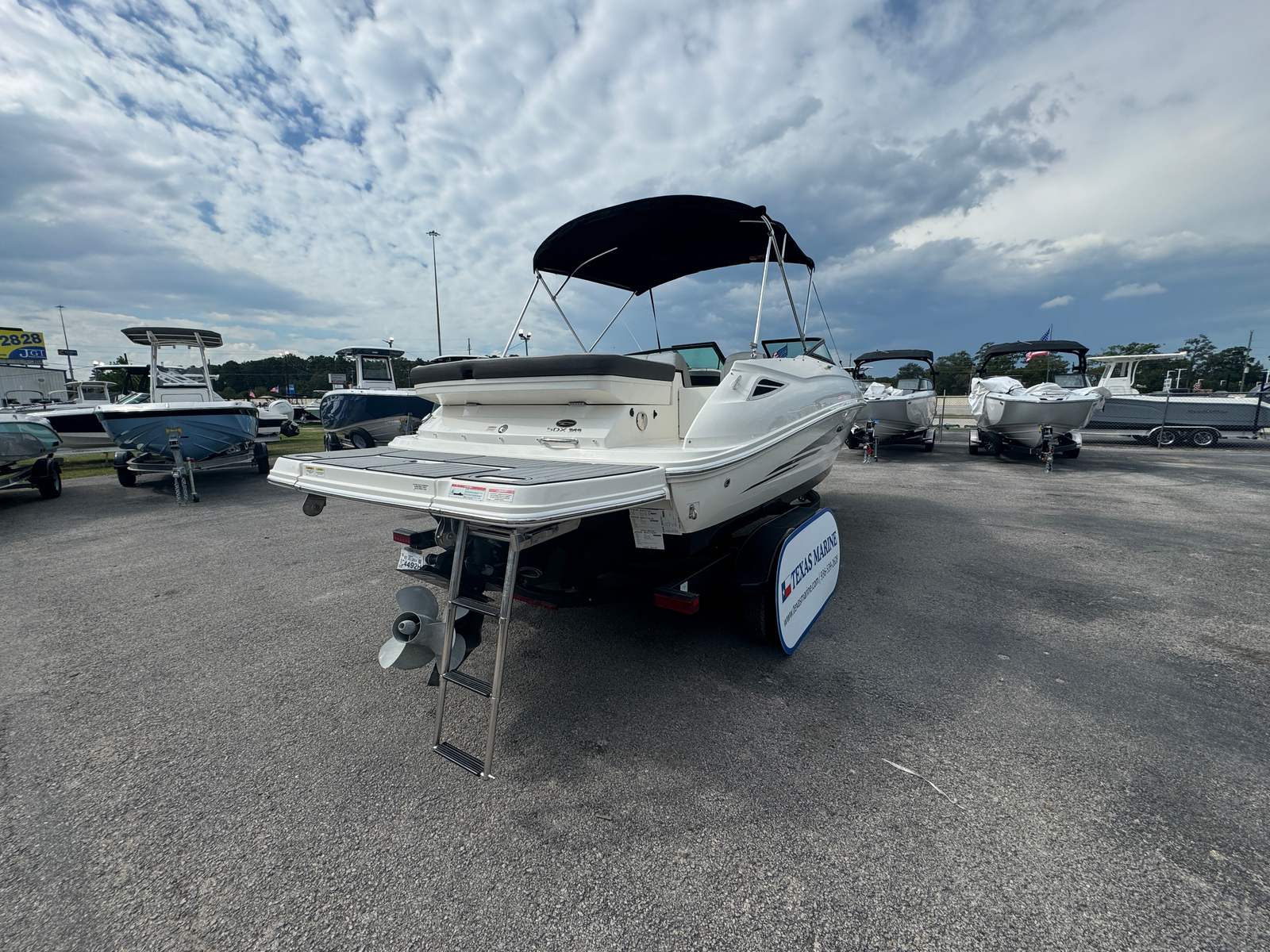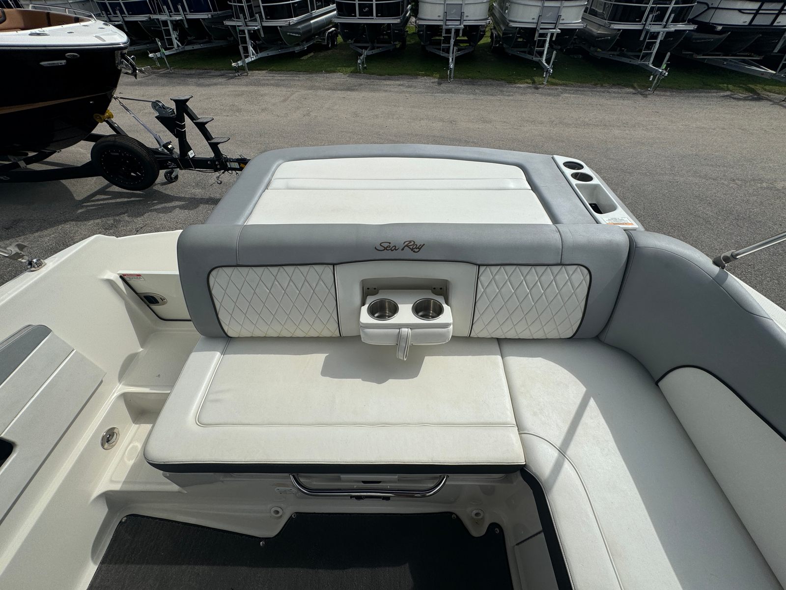 This Sea Ray boat for sale comes loaded with special features designed to enhance your boating experience. The Bimini top provides shade and protection from the sun, allowing you to stay comfortable during long days on the water. The Bluetooth stereo system lets you set the perfect soundtrack for your adventures, whether you’re relaxing or celebrating with friends. A cover helps protect your investment when the boat is not in use, keeping it looking its best season after season. The tandem axle trailer with swing tongue makes transportation and storage a breeze, offering flexibility and convenience for owners who want to explore new waterways. Dual prop technology improves handling and efficiency, while annual service ensures the boat is always ready for action.