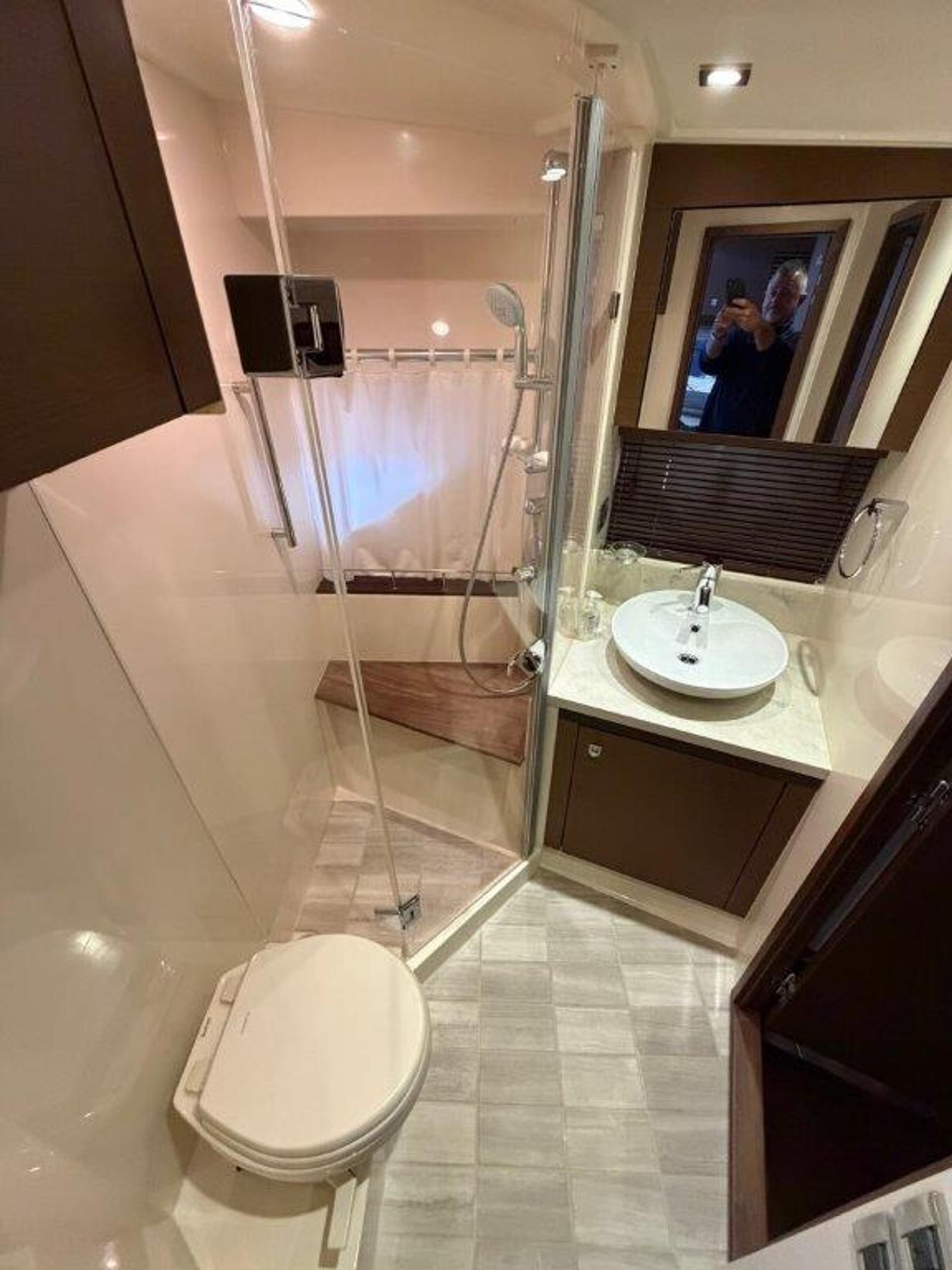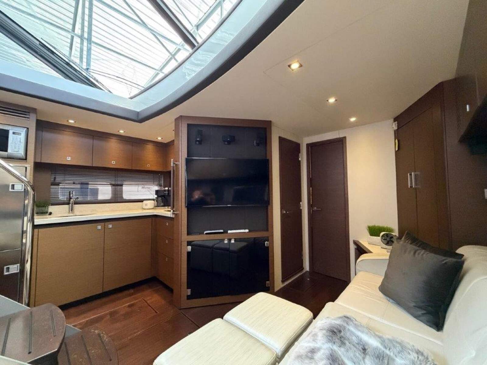 Below deck, the midship master suite is an oasis of comfort, featuring upgraded fabrics and finishes along with separate head and shower compartments. The main cabin boasts a gourmet galley and plush seating in a naturally lit, atrium-style space, making it ideal for gatherings or quiet relaxation.