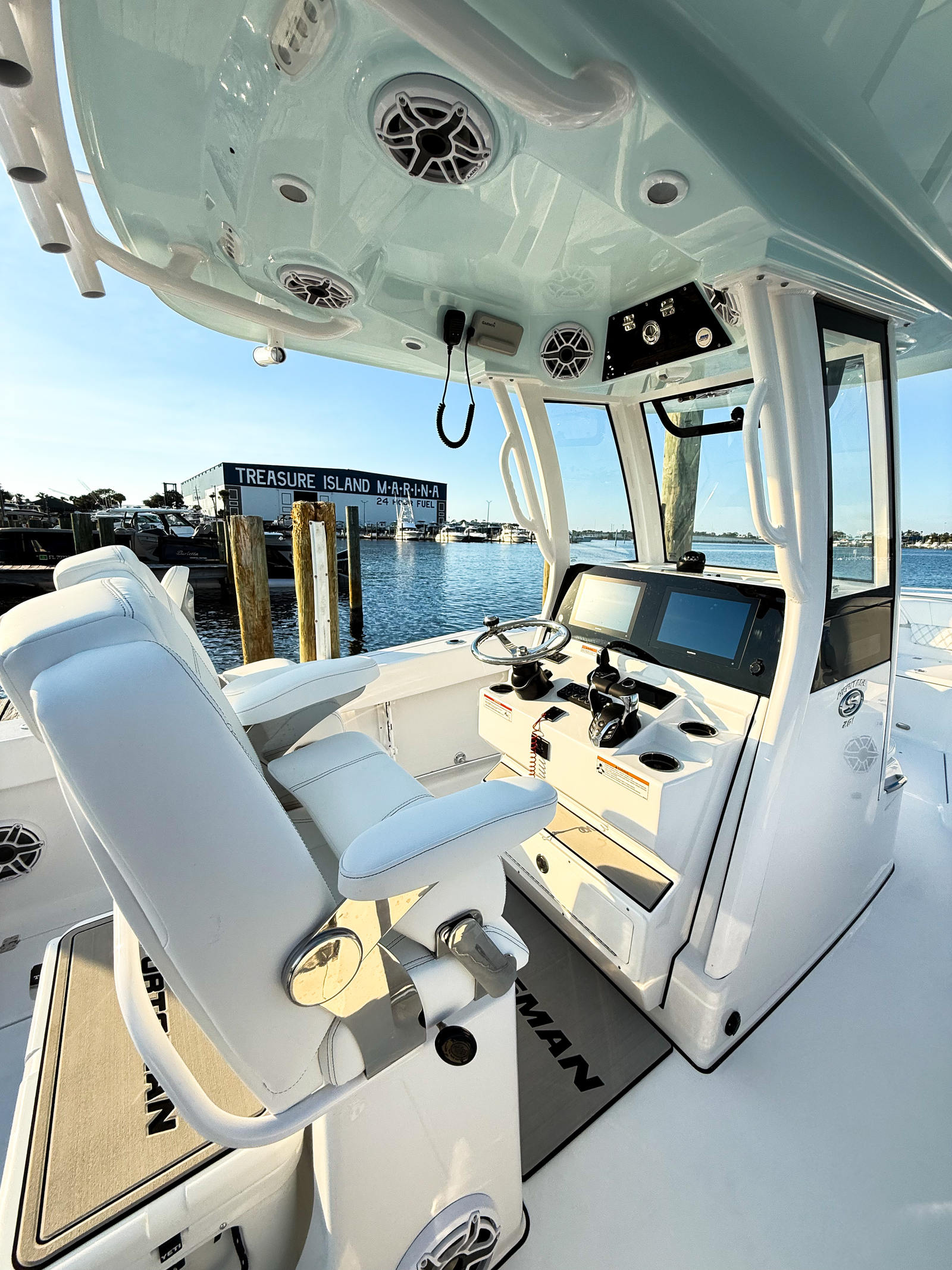 Powering the Heritage 261 are twin Yamaha F200XSA2 engines, each delivering 200 horsepower for a combined total of 400 horsepower. These engines are finished in a sleek white, enhancing the boat’s overall aesthetic while offering robust and efficient performance. The Yamaha Helm Master EX system, complete with autopilot functionality, ensures precise handling and effortless navigation, whether you’re cruising at high speeds or maneuvering in tight spaces. The advanced steering system, featuring the Edson 13” stainless steel comfort grip steering wheel with PowerKnob, provides smooth and responsive control, making every journey enjoyable and stress-free.
