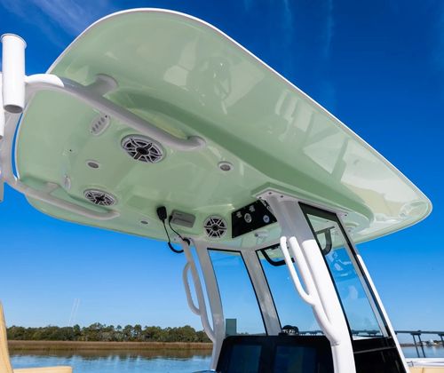 Step aboard the Sportsman Open 262 and you will immediately notice the attention to detail and premium features that set this boat apart. The Serenity Sileather Smoky Gray upholstery offers a luxurious and durable seating experience, ensuring comfort for you and your guests. The fiberglass console, complete with a fiberglass liner and cooler seat, provides a functional and stylish command center, while the fiberglass hard top with LED lighting adds both protection and ambiance for day and night excursions. The hardtop underside in Jet Black and black powder coating throughout the boat create a cohesive and sophisticated aesthetic.At the bow, a sundeck and table with a cushion invite relaxation and socializing, making it the perfect spot for sunbathing or enjoying a meal with friends and family. The fiberglass leaning post features dual premium chairs and integrated tackle storage, catering to both comfort and practicality for anglers and leisure seekers alike. Navigation and connectivity are elevated by two Garmin 12-inch GPS screens with built-in Wi-Fi, ensuring you stay on course and connected wherever your adventures take you.