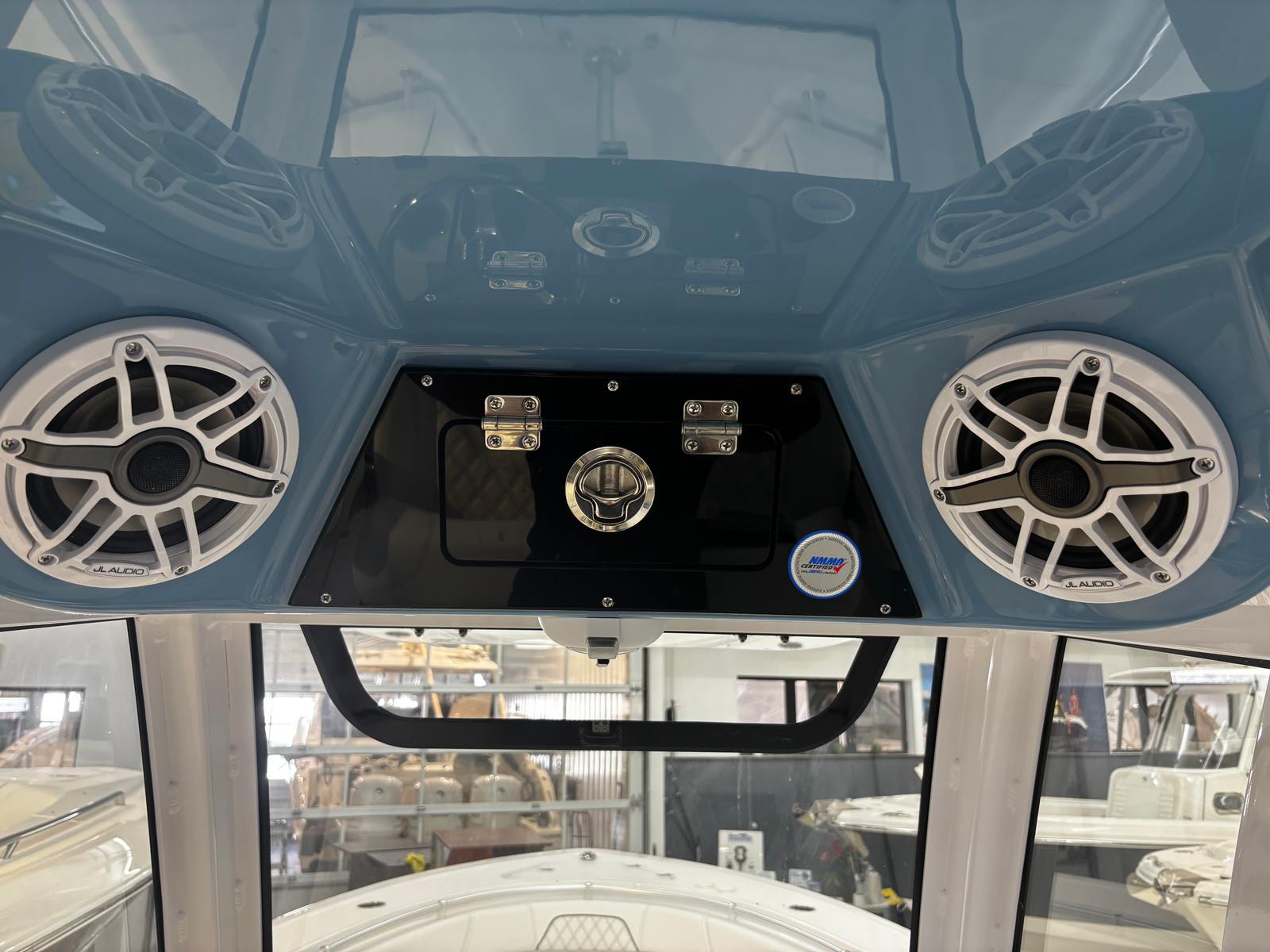 The Sportsman Open 262 is a brand-new 2026 model, measuring an impressive 26.5 feet in length. Its sleek profile and modern lines make it a head-turner at any marina or dock. The Harbor Haze Blue hull sides paired with a Snow White hull bottom create a striking visual contrast, while the HardTop underside in matching Harbor Haze Blue adds a touch of sophistication. The Icecap White upholstery and White powder coating further enhance the boat’s elegant appearance, ensuring you’ll make a statement wherever you go.