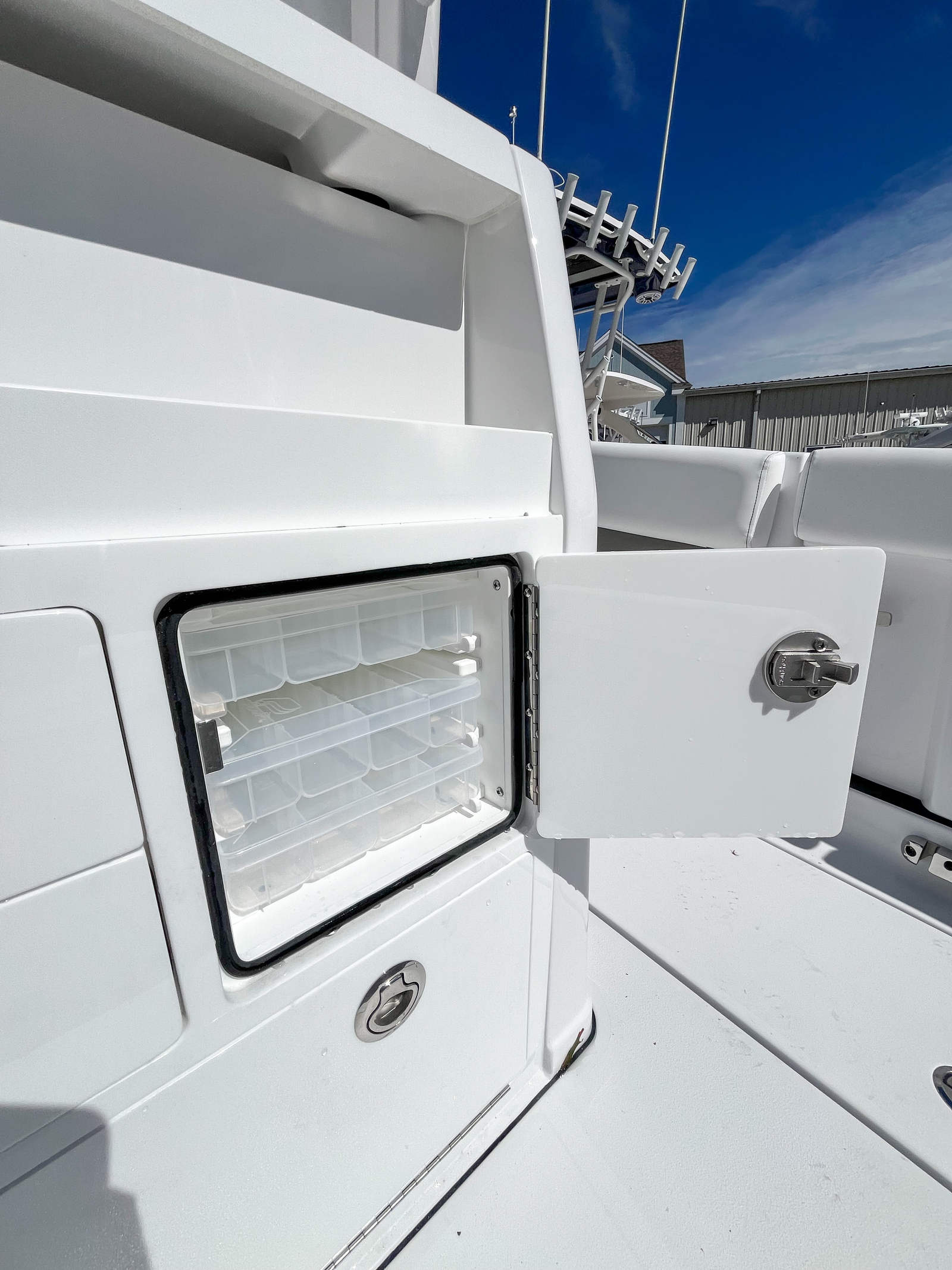 Step aboard and discover a world of premium features designed to elevate your boating experience. The Captains Orientation ensures intuitive control and easy access to all essential functions, making navigation a breeze. The Serenity Sileather Icecap White Upholstery offers both comfort and durability, providing a luxurious seating environment that stands up to the elements. The Fiberglass Leaning Post with Tackle Center and Sink is a game-changer for anglers, offering convenient storage and workspace for bait and gear. Powder Coating Color in White adds a touch of sophistication and protects key components from the marine environment. The Fiberglass Hard Top with LED Lighting not only provides shade and shelter but also creates a vibrant atmosphere for evening cruises, while the Hardtop Underside Color in Harbor Haze Blue adds a unique visual accent. For those who love fishing, the Electric Reel Outlets are a must-have, making deep-sea angling more accessible and enjoyable. Navigation is made effortless with two Garmin 16" GPS Screens featuring built-in Wi-Fi, ensuring you stay connected and informed wherever your journey takes you. The Dual Premium 60-40 Bench offers versatile seating arrangements, maximizing comfort for all passengers.