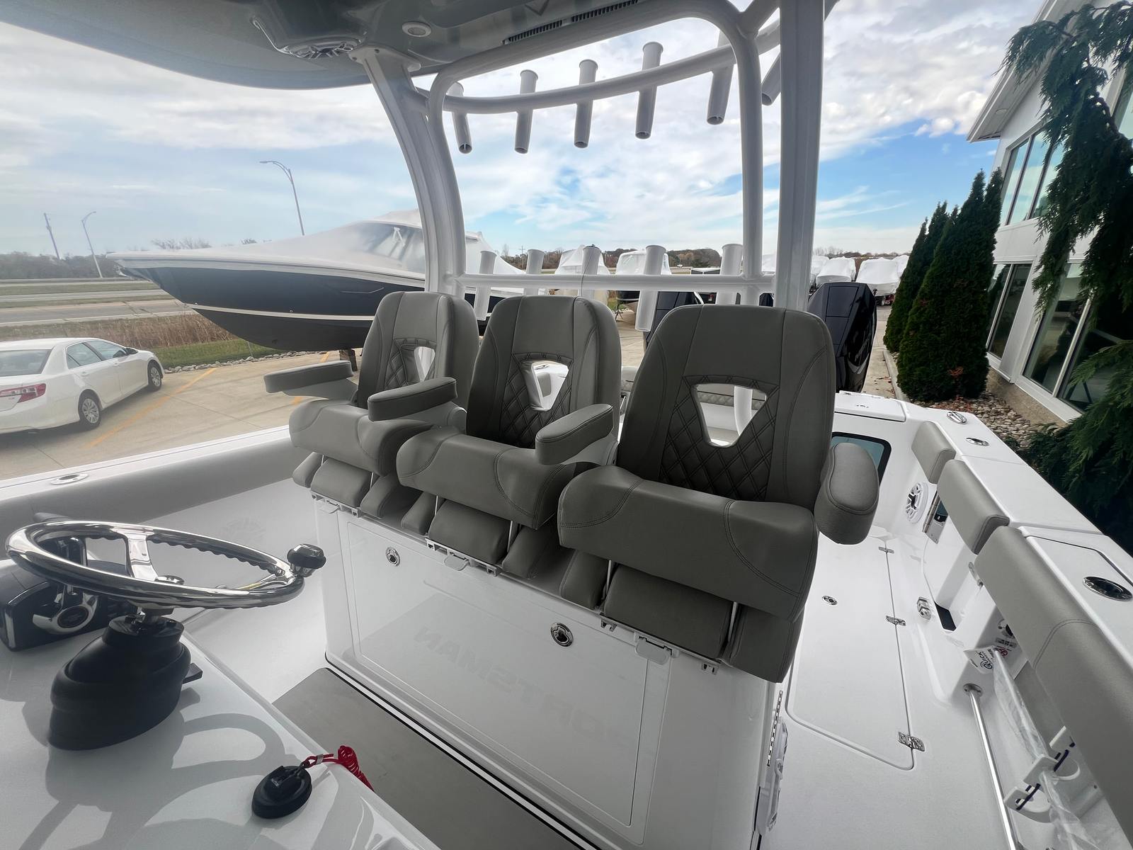 Step aboard the Sportsman Open 352 and discover a world of premium features designed to enhance your boating experience. The fiberglass console with FG liner and a 65-quart cooler seat provides both comfort and convenience, keeping refreshments close at hand during long days on the water. The fiberglass hard top is equipped with integrated LED lighting, illuminating your deck for evening outings and adding a modern touch to the boat’s profile. The hardtop underside, finished in Storm Cloud Gray, complements the hull’s color scheme for a cohesive and stylish look.Enjoy the luxury of Sileather Ash Gray upholstery, offering a soft, durable, and easy-to-clean surface for all your seating areas. The fiberglass leaning post features a tackle center and sink, making it easy to organize gear and clean up after a successful fishing trip. Stay cool and comfortable even on the hottest days with the 12V 3500 BTU air conditioning system, ensuring a pleasant environment for everyone onboard. Navigation is a breeze thanks to the dual Garmin GPSMAP® 9222 chartplotters, providing advanced mapping and real-time data to keep you on course and informed.