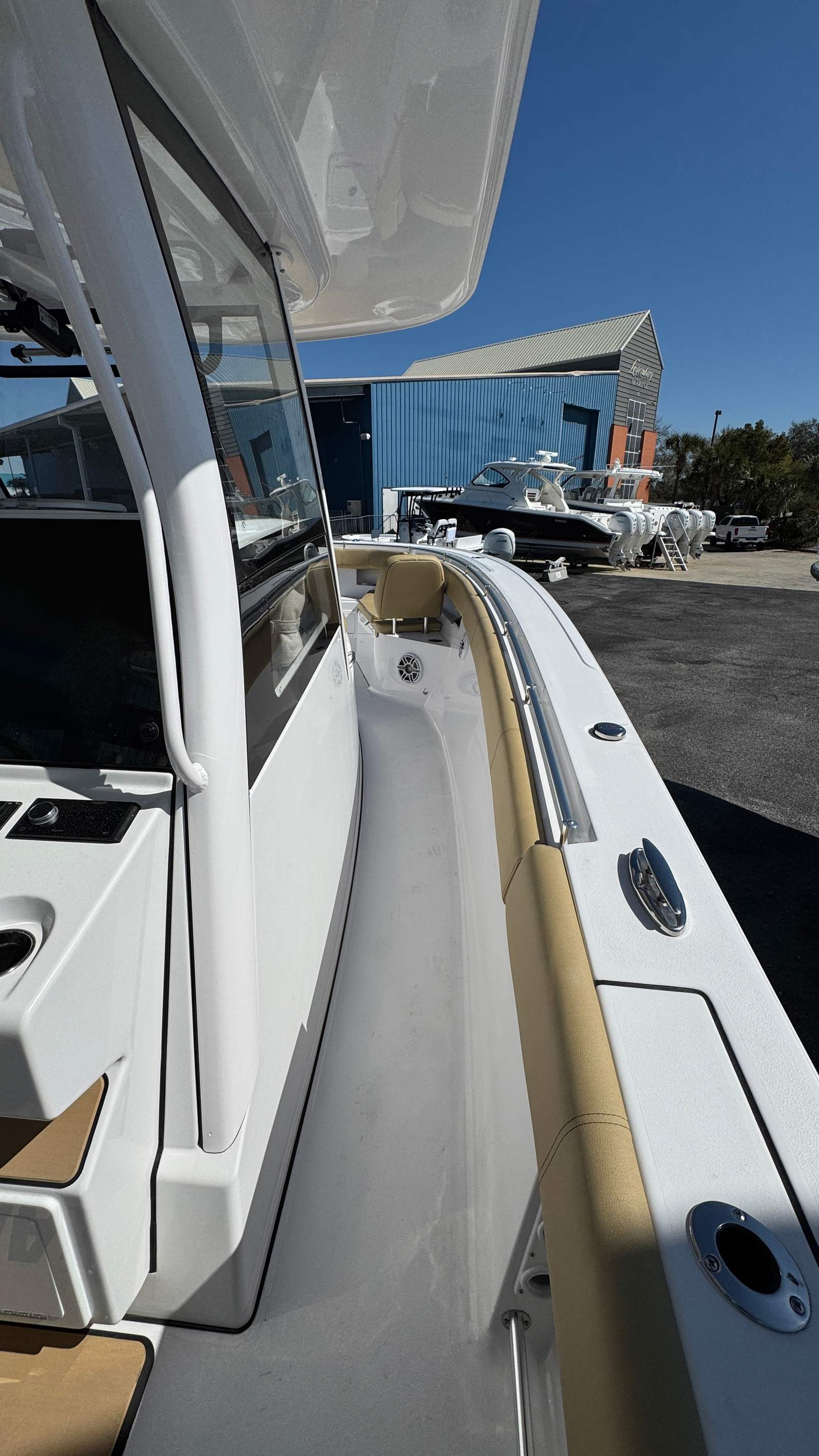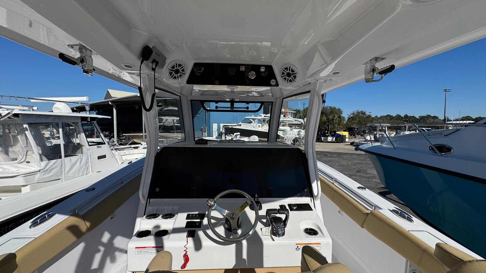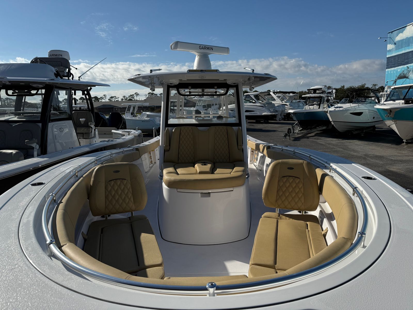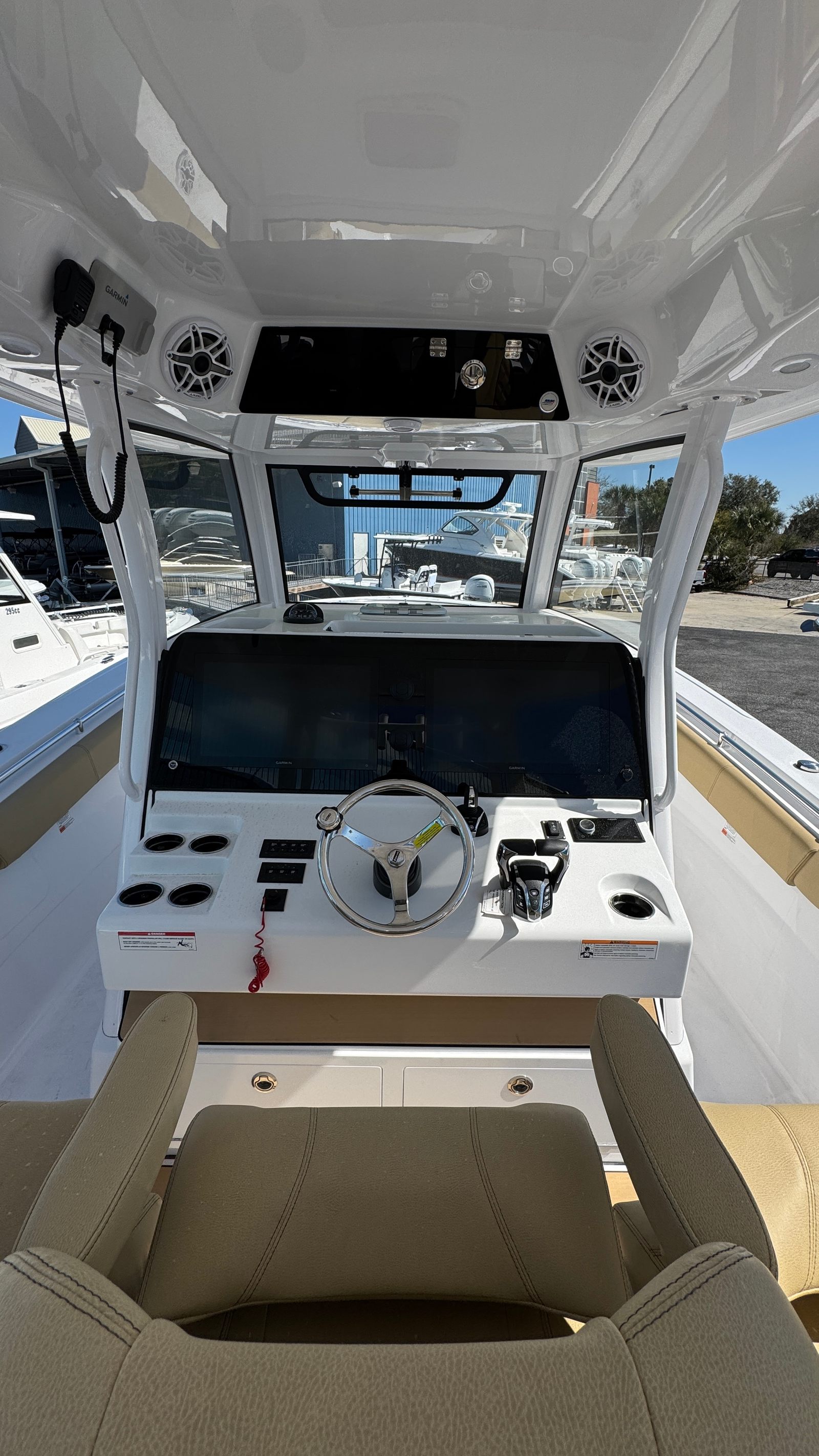 The 2025 Sportsman Open 352 is a testament to modern boat design, offering a generous length of 35.17 feet that provides ample space for relaxation, entertainment, and adventure. With its sleek lines and contemporary styling, this Center Console boat commands attention at the marina and on open water. The hull bottom and hardtop underside are finished in Snow White, giving the vessel a crisp, clean look that complements its Desert Tan upholstery and white powder coating. Every detail of the Open 352 is crafted to enhance your time on the water, from its spacious deck layout to its advanced technology.