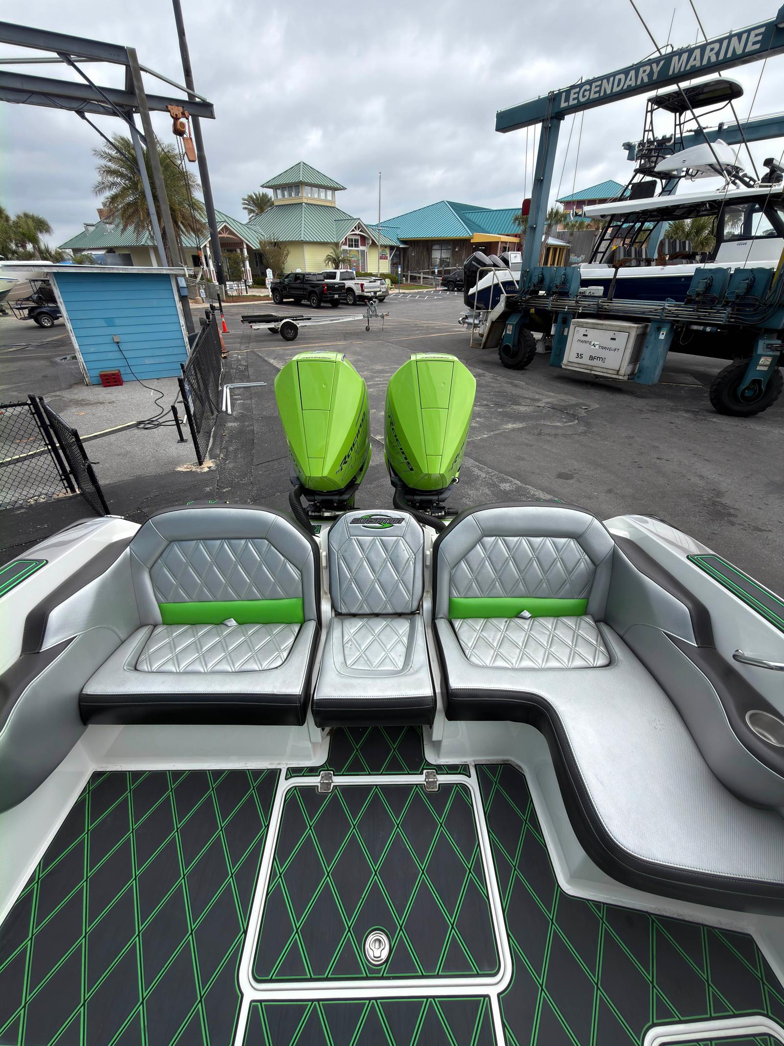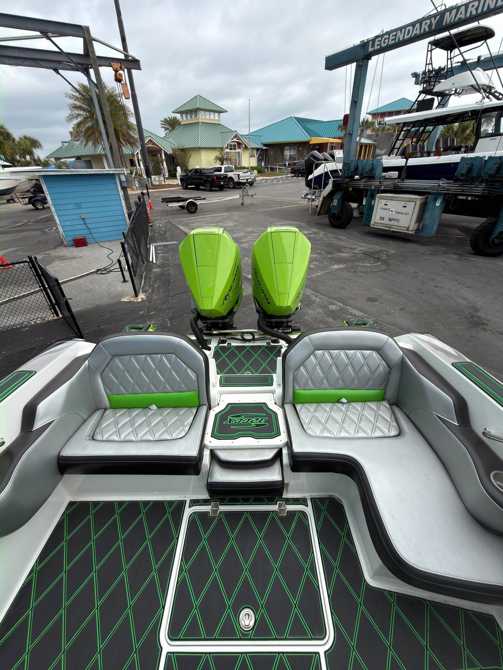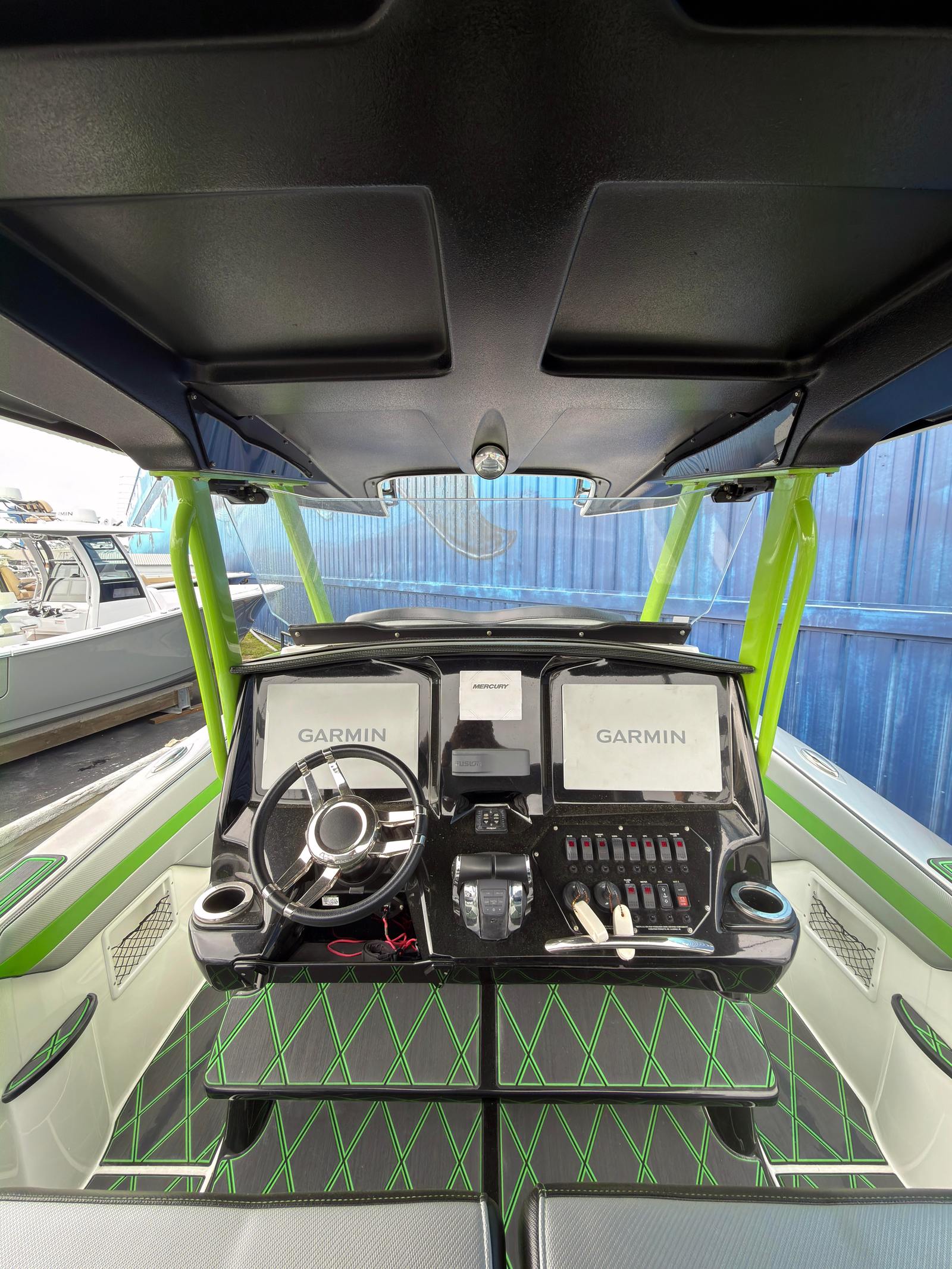 Prepare to turn heads everywhere you go with this stunning 2020 Sunsation 32 CCX. Finished in a custom, high-impact lime green and black graphics package, this boat is the perfect fusion of exhilarating performance and center console versatility. With only 133 hours on its twin Mercury Racing 450R engines, this vessel is barely broken in and presents in immaculate condition.