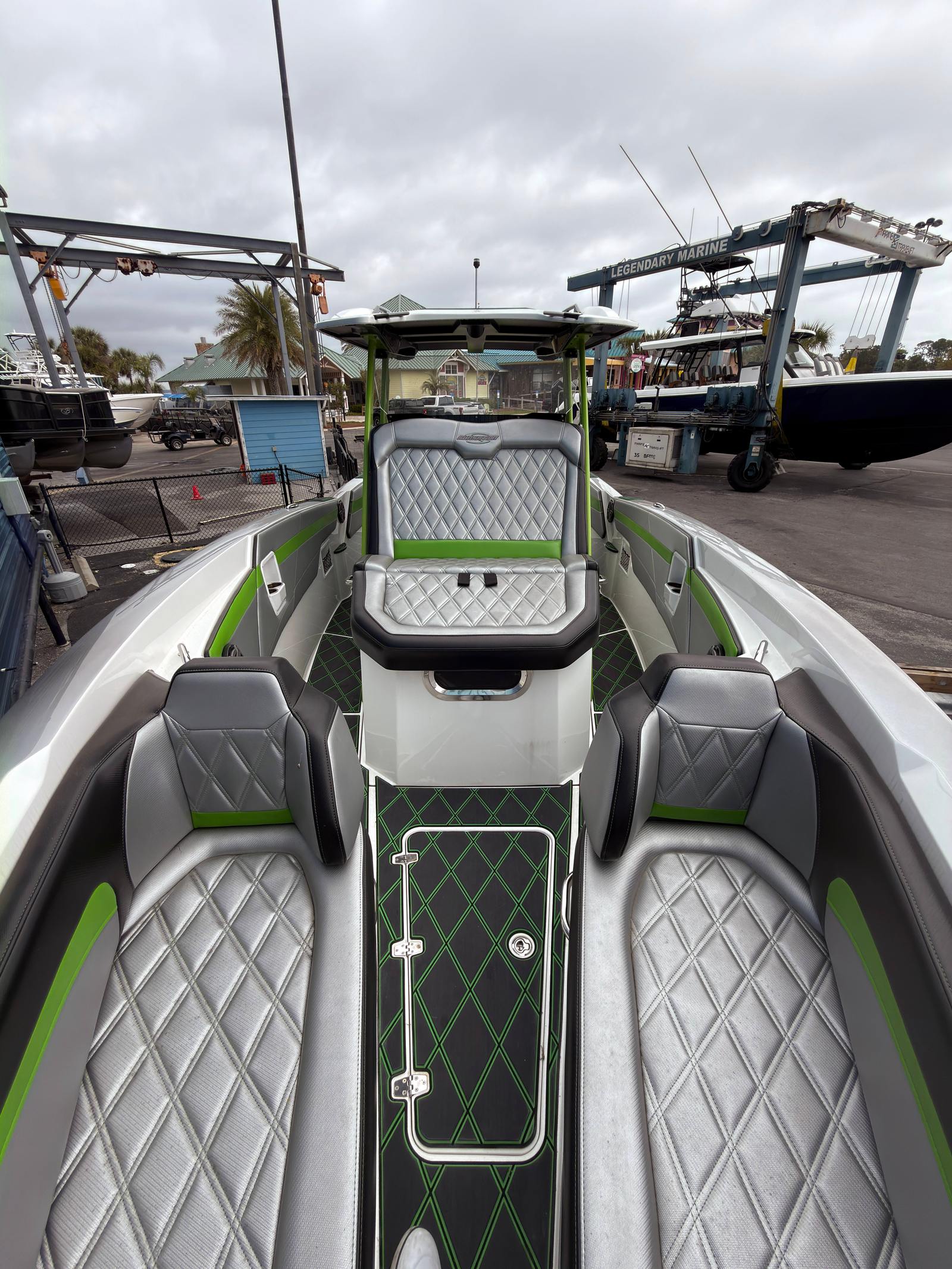 Powered by a combined 900 horsepower, the race-proven hull delivers a thrilling, stable, and dry ride at blistering speeds. Whether you're heading to your favorite sandbar, embarking on a poker run, or cruising the coastline, the 32 CCX is built to perform and impress. The spacious and intelligently designed cockpit features premium custom-stitched upholstery, providing comfort for all your guests.