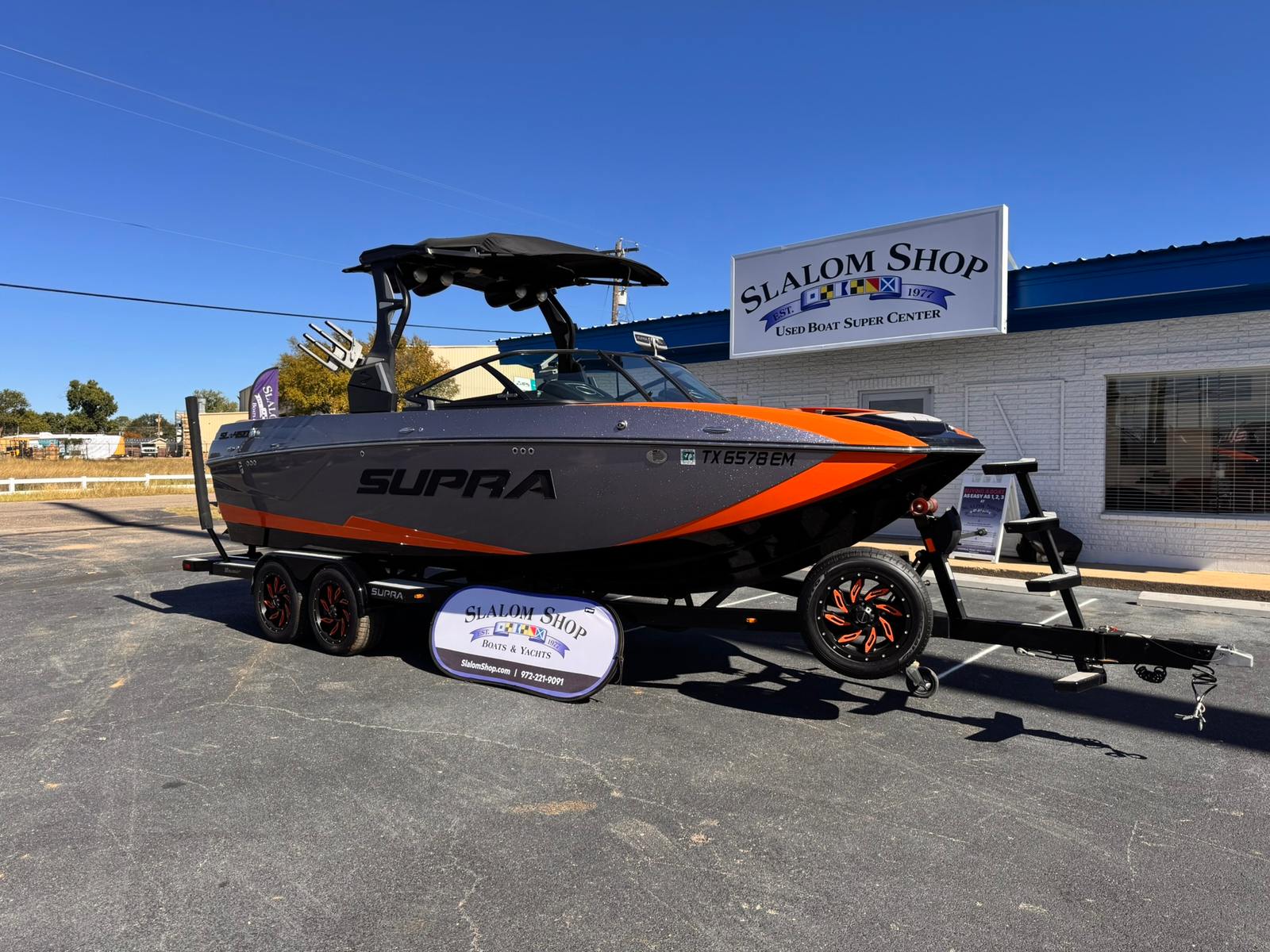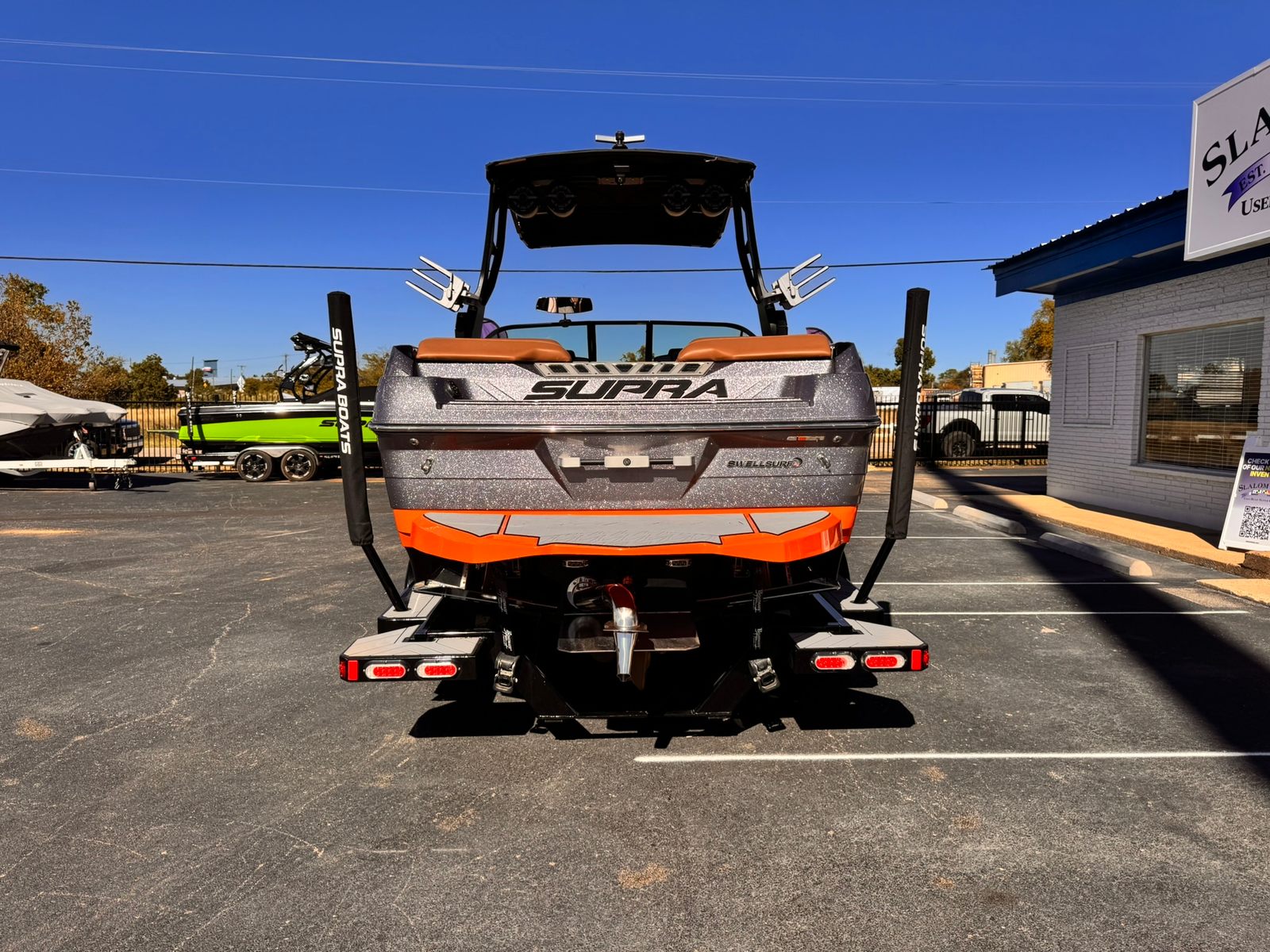 Now available on consignment at our New Used Boat Super Center in Lewisville, this pristine 2019 Supra SL 450 is a high-performance luxury wake boat, designed for surfing, wakeboarding, and family fun. Finished in striking Gunmetal Flake, Orange, and Black gelcoat, it combines cutting-edge technology with attention to detail and superior build quality.